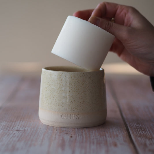 We work with the best artisan potters and glassblowers across the UK to hand craft our beautiful candle pots. And our candles are hand poured with care here on the farm. Every refillable candle is a labour of love and an expression of creativity and connection.